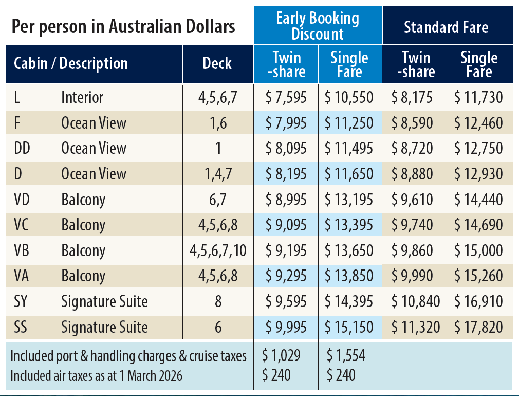 All Cruise Offers Value Holidays are heavily discounted and available for a limited time only. For this reason, we require a deposit of $1,500 per person at the time of booking. This payment is non-refundable. The deposit should be sent with a completed Cruise Offers booking form that lists your requested cabin category. As soon as the booking is confirmed, (usually within 24 hours), a cruise confirmation advice will be posted to the client. The confirmation advice will contain all details. The passenger must also complete the online Holland America cruise personaliser at www.hollandamerica.com. Final payments are due to be paid to Cruise Offers 90 days prior to the commencement of the Westerdam fly/cruise. A 1.5% administration fee will be added to payments by Visa, Mastercard and American Express. Any changes made to a booking after purchase may incur fees.